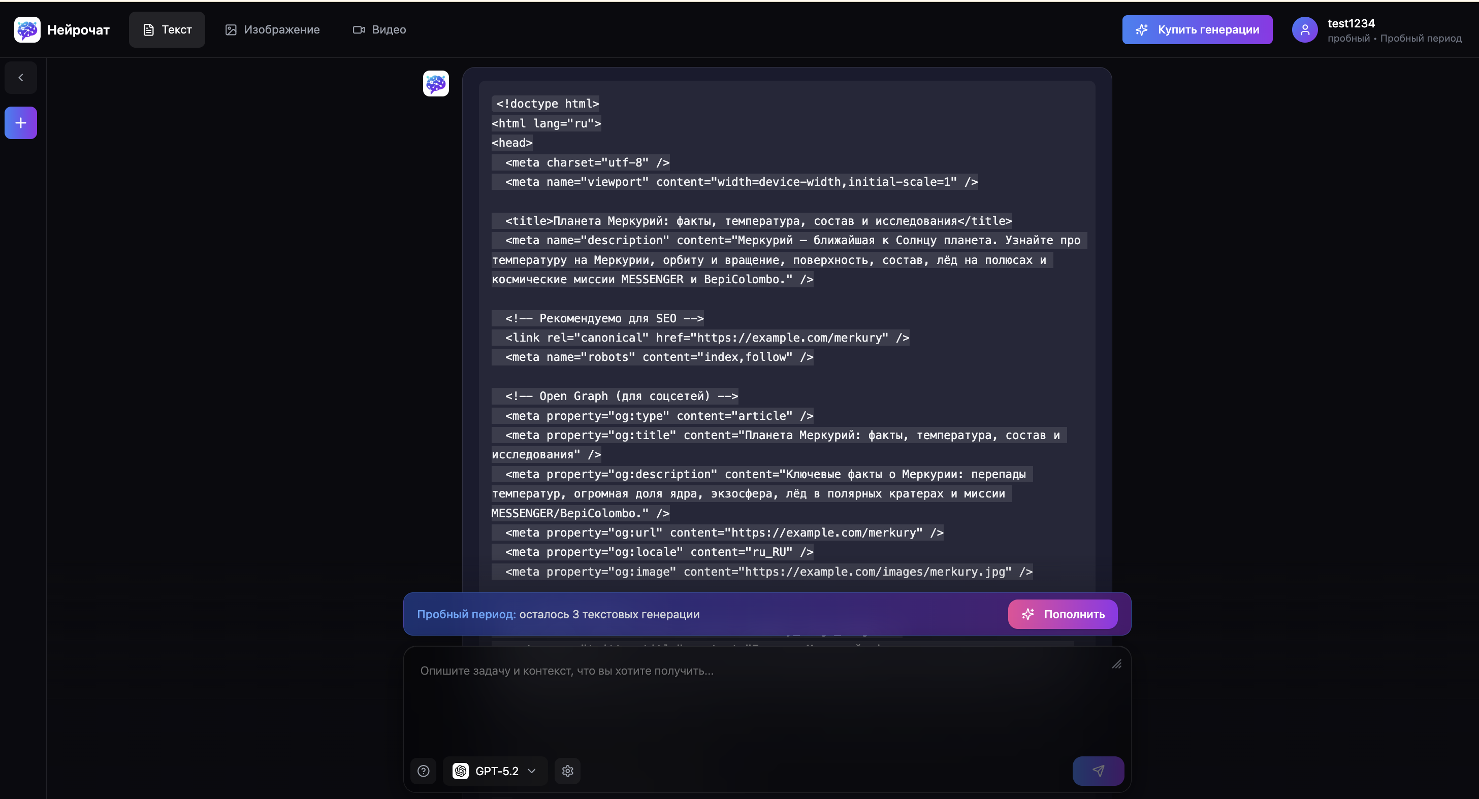 GPT Free в Нейрочат — это бесплатный базовый доступ. Введите запрос на русском, и модель ответит на русском. На бесплатном уровне есть ограничения на количество запросов, но для тестирования хватает. Для снятия всех ограничений подписка начинается от 449 ₽/мес.