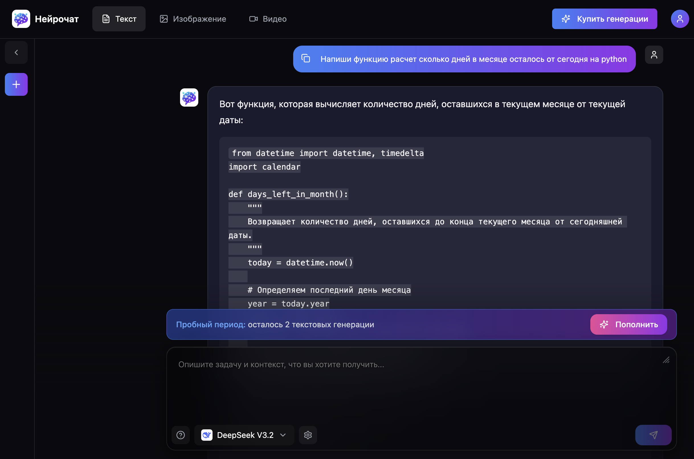 В Нейрочат есть пробный доступ для новых пользователей. Подписка от 449 ₽/мес открывает DeepSeek V3.2 без ограничений. Начните с пробного периода, протестируйте на своих задачах — и поймёте, стоит ли платить.