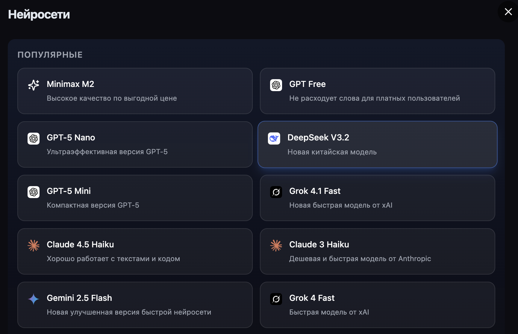 | DeepSeek V3.2 | Универсальные задачи, техническое письмо, код | Быстрая | В подписке от 449 ₽ |